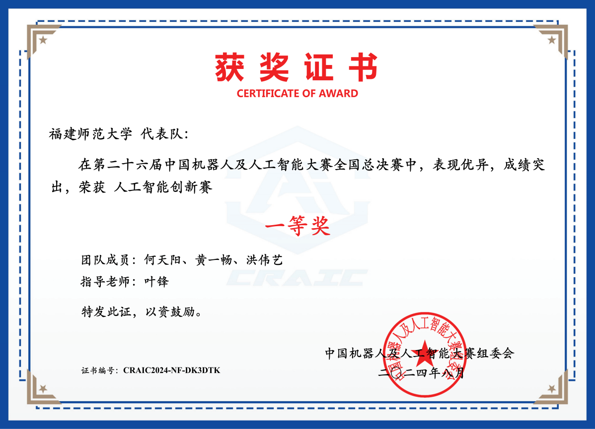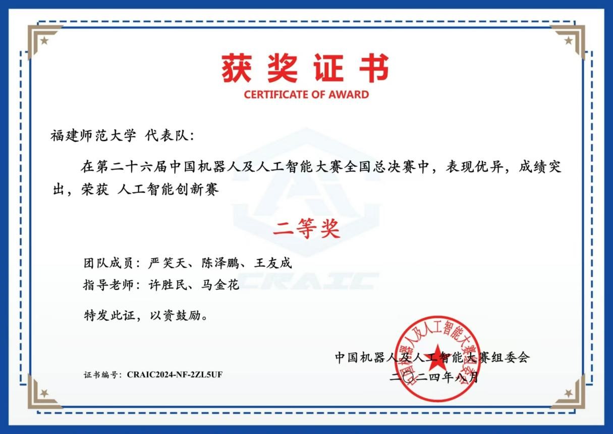 计算机与网络空间安全学院2021级本科生何天阳、黄一畅、洪伟艺团队的参赛作品《基于Stable DiffusionAIGC智慧陶瓷平台》(指导老师:叶锋)荣获全国总决赛人工智能创新赛一等奖,2023级研究生严笑天、陈泽鹏、王友成团队的参赛作品《基于深度学习的暴力行为检测系统》(指导老师:许胜民、马金花)荣获全国总决赛人工智能创新赛二等奖。