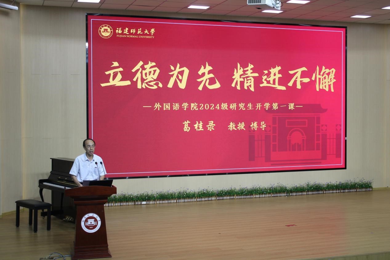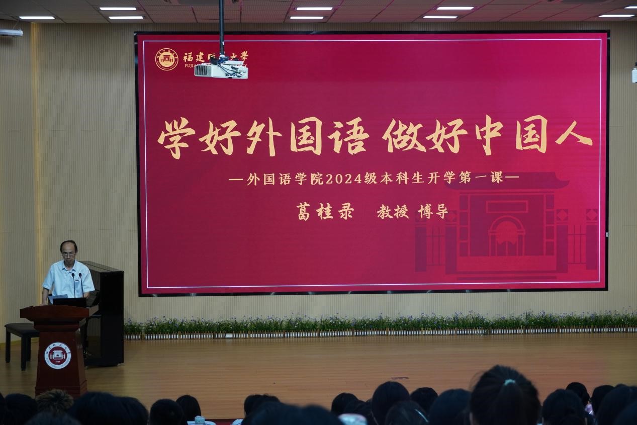98日上午,外国语学院院长葛桂录教授在仓山校区陈明金教学楼多功能厅分别为2024级研究生、本科生新生讲授“开学第一课”。