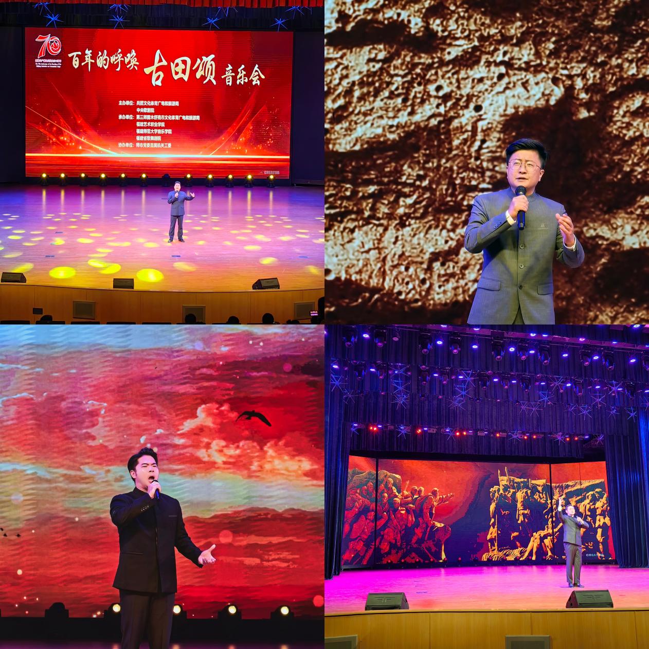 为庆祝新疆生产建设兵团成立70周年,由兵团文化体育广电和旅游局、中央歌剧院主办,师市文化体育广电和旅游局、福建艺术职业学院、乐鱼(中国)音乐学院、福建省歌舞剧院承办的大型原创组歌“百年的呼唤——《古田颂》”声乐专场音乐会,于9月12日、13日晚在新疆图木舒克市唐王城剧场举办。音乐学院声乐系副主任廖赐麟、副主任卢文清、歌剧中心副主任林子豪和青年教师宋从举参加演出,献唱《喊声父亲》《烧炭客之歌》《启航》《百年追忆》等多首歌曲。