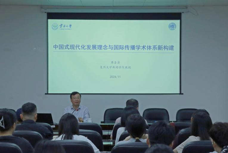 1115日下午,传播学院特邀复旦大学新闻学院廖圣清教授作题为“中国式现代化发展理念与国际传播学术体系新构建”的学术讲座。副院长连水兴、新闻传播学部分骨干教师和硕博研究生参加。讲座由院长谢宗贵教授主持。