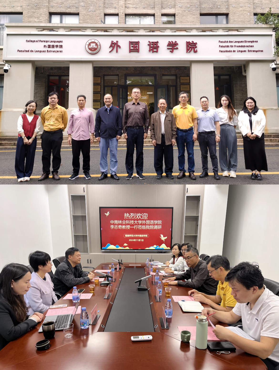 近日,中南林业科技大学外国语学院翻译系学科带头人李志奇教授、翻译系主任李广践副教授一行,广西师范大学外国语学院党委书记江飞、副院长刘明录一行到外国语学院调研交流。学院党委书记林鲁文、副书记肖良建、副院长尤泽顺以及相关老师参加调研。