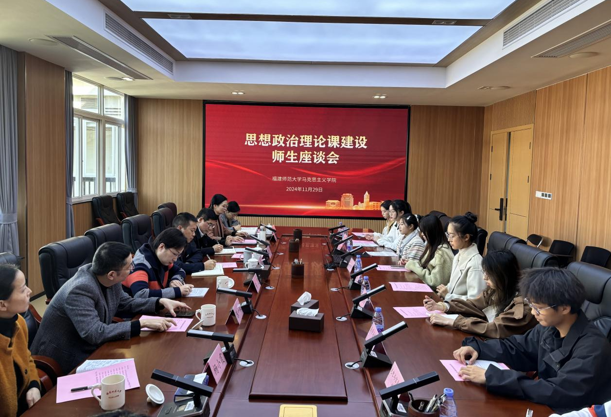 11月29日下午,马克思主义学院召开思政课建设师生座谈会。学院党委书记阮传瞰,副书记、纪委书记杨君火,副院长黄雯,各思政课教研部主任以及来自法学院、传播学院、社会历史学院、数学与统计学院等10所学院的2023级、2024级本科生代表参加了座谈。