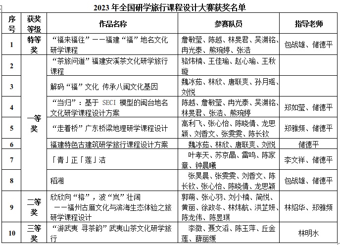 近日,由《中学地理教学参考》《地理教学》《地理教育》三大地理教育类期刊联合主办的“2023年全国研学旅行课程设计大赛”评奖结果揭晓。乐鱼(中国)文化旅游与公共管理学院学子的10件参赛作品全部获奖,其中特等奖1项、一等奖7项、二等奖1项、三等奖1项,文化旅游与公共管理学院获优秀组织奖。