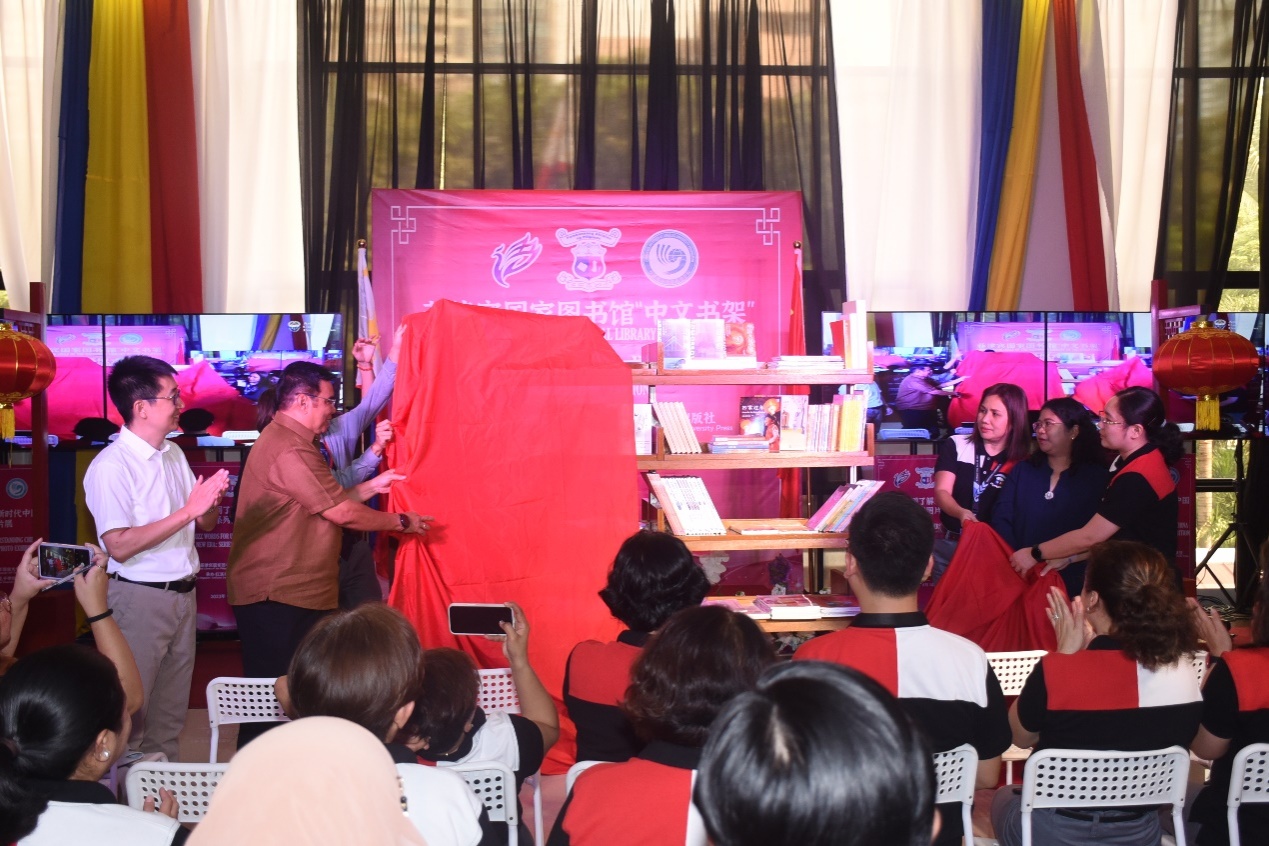 北京语言大学出版社向菲律宾国家图书馆捐赠图书200余册,到场嘉宾共同为“中文书架”揭幕。随后,现场领导和嘉宾共同参观了《100个热词了解新时代中国》图片展,以及红溪礼示大学孔子学院志愿者教师们准备的书法、中国结等文化体验活动。