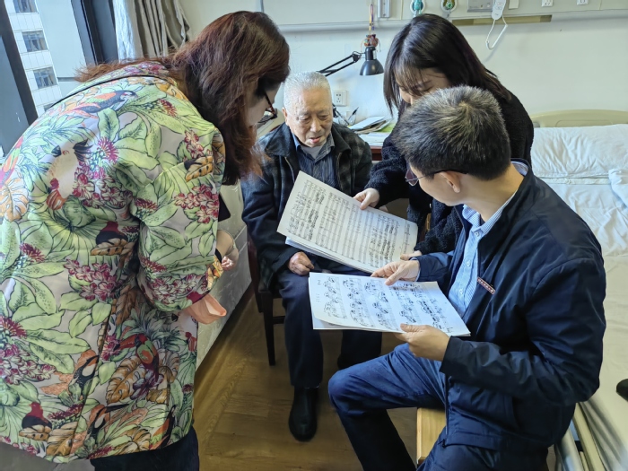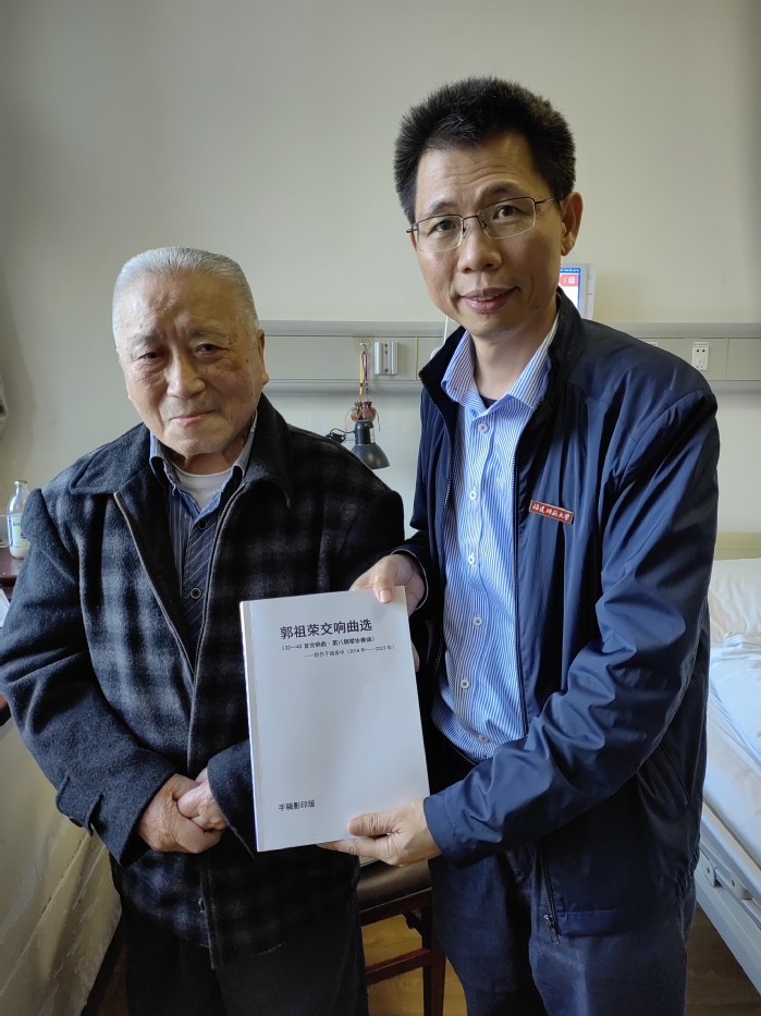 95岁高龄的郭祖荣老师对来自母校的探访表示衷心感谢,对母校事业发展取得的成就感到欣喜和自豪。他深情回忆了在母校学习、工作的美好时光,展示了他在病房中最新创作的第47交响乐的手稿,分享了交响乐创作的最新体会。他表示会继续关心和支持母校发展,并将其代表作《郭祖荣交响曲选(32-43首)》赠予母校,祝福母校116周年生日快乐,希望音乐学院发展越来越好,培养出更多优秀的音乐人才。