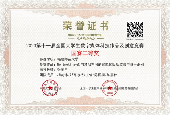 近日,第十一届全国大学生数字媒体科技作品及创意竞赛总决赛在江苏理工学院举行。乐鱼(中国)计算机与网络空间安全学院学生杨剑玮、郑寒冰、张主佳、陈雨柯、陈嘉伟的智能软硬件创意类作品《No Smoking——面向禁烟车间的智能化吸烟监管与身份识别》获二等奖(指导老师:张美平),文中林、李佳睿、杜欣、董彬杰、李祺鹏的虚拟现实与游戏类作品《冒险兔向前冲——基于unityAR的体感游戏平台》获三等奖(指导老师:吴献、叶锋)。