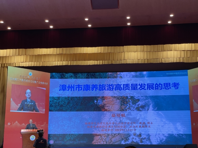 文化旅游与公共管理学院骆培聪教授应邀参加会议并作“漳州市康养旅游高质量发展的思考”主旨演讲。他在分析康养旅游内涵、康养旅游产业发展历程、漳州市康养旅游高质量发展的主要优势、存在不足的基础上,提出了政府引导、规划先行,项目带动、多元开发,发挥优势、加强合作,市场运作、激发活力,多种渠道、培养人才,加大宣传、唱响品牌等建议。他的演讲引起与会嘉宾的热烈反响。期间,他接受多家媒体的采访。