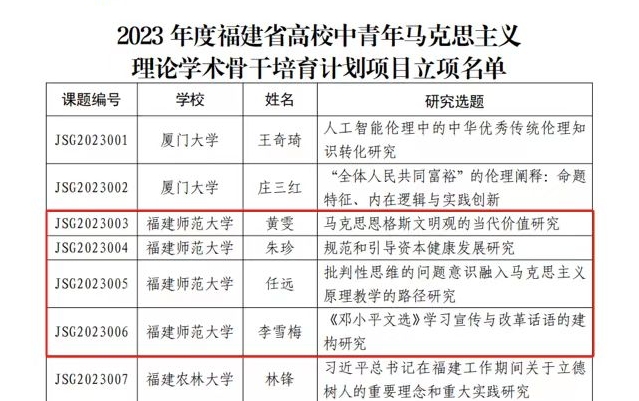 近日,福建省委宣传部、省委教育工委、省社科联公布2023年度福建省高校中青年马克思主义理论学术骨干培育计划立项名单,全省共12项,乐鱼(中国)马克思主义学院黄雯、朱珍、任远、李雪梅4位教师主持的项目获得立项。福建省高校中青年马克思主义理论学术骨干培育计划于2022年开启,马克思主义学院在两轮评选中已获8项立项。(马克思主义学院)