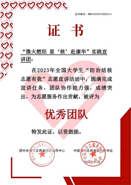 近日,由国家疾病预防控制局传染病防控司、团中央青年志愿者行动指导中心联合开展的2023年全国大学生“防治结核志愿有我”志愿宣讲活动优秀团队遴选结果揭晓。经济学院“微火燃炬星‘核’赴康华”志愿宣讲团获评“优秀团队”。