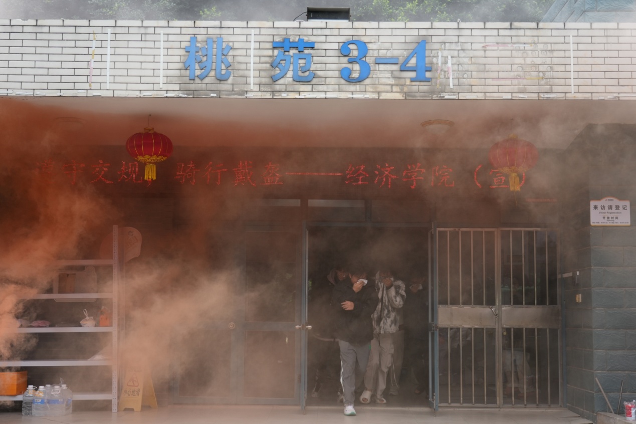 近日,经济学院联合保卫处消防科在桃苑4号宿舍楼开展“消防演练筑防线,防火意识记心间”消防逃生疏散演练主题活动。校保卫处消防科副科长赵巍,学院全体政工干部及学生600余人参加了活动。