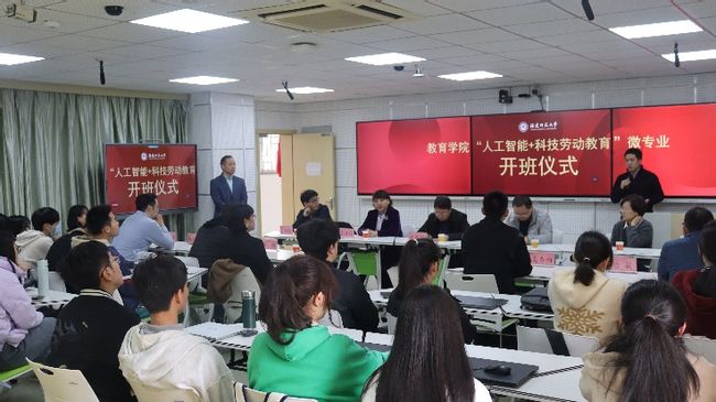 会上,杨发福介绍了微专业的建设理念、保障支撑等,了解同学们对微专业学习的预期,向开办微专业的教育技术系教师团队提出要求,期待学院为专业建设与课程改革探索可行路径,为学校教学创新作示范。王洪泠介绍了新时代中小学跨学科融合教育对教师能力的新要求,希望同学们能够通过微专业的学习,提升人工智能技术技能和科技创新辅导能力,为更好适应新时代学校教育需求做好准备。教育学院副院长王伟宜表示,开办“人工智能+科技劳动教育”微专业旨在发挥教育技术学的专业优势,提升各专业师范生的跨学科教学能力,培育青少年科创辅导员。创客教育和人工智能教育产业代表“大象光年”和“大智汇”相关负责人分别介绍了青少年科创教育的发展趋势,表示将为学生提供丰富的实践机会,助力学生未来职业发展。