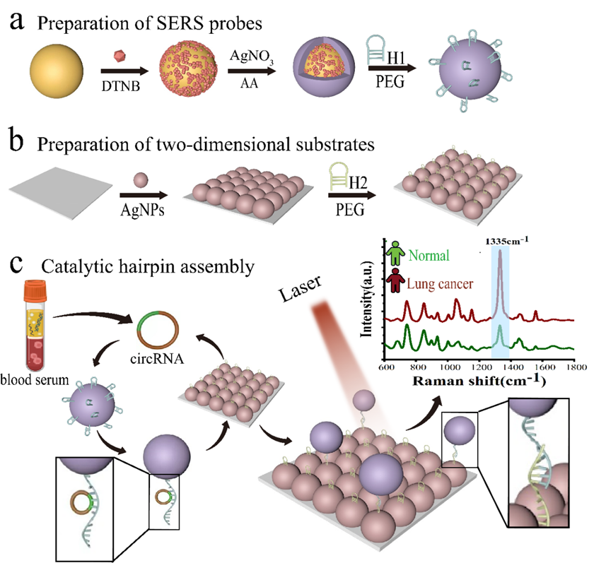 近日,光电与信息工程学院冯尚源教授、林多教授团队联合福建医科大学附属肿瘤医院许元基博士团队,在ACS Sensors (IF=8.9)杂志上发表论文“Optical Nanobiosensor Based on Surface-Enhanced Raman Spectroscopy and Catalytic Hairpin Assembly for Early-Stage Lung Cancer Detection via Blood Circular RNA”。研究结果显示,该团队研发了一种基于表面增强拉曼光谱(SERS)联合催化发夹组装(CHA)技术的光学纳米生物传感器,该传感器能够通过血液样本高效检测与肺癌发生发展密切相关的环状RNAcircSATB2),为早期肺癌的筛查和治疗提供新的方法。